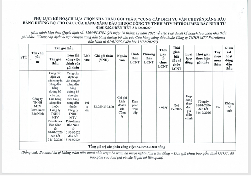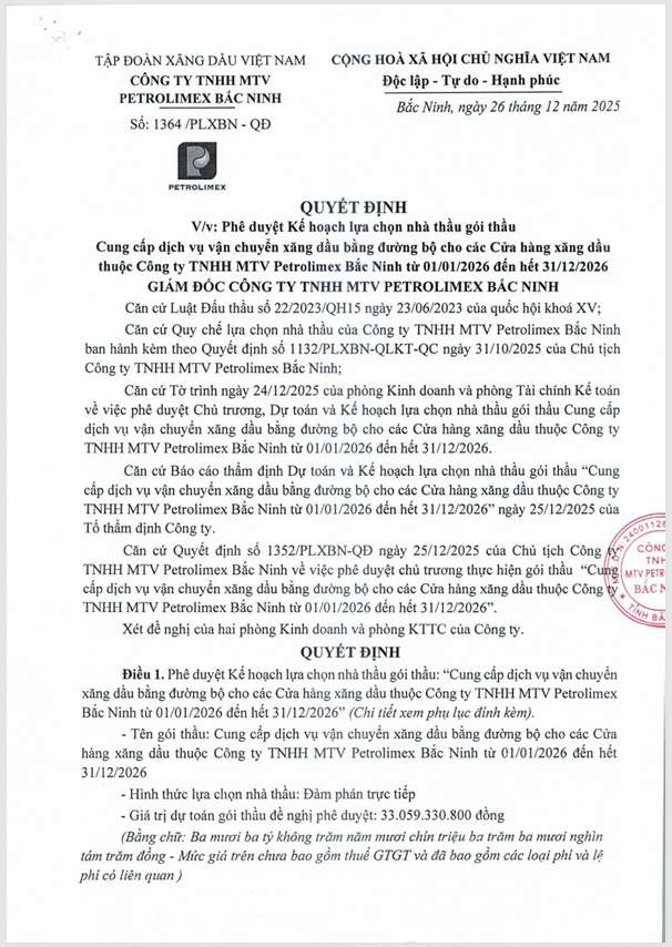 Công ty TNHH MTV Petrolimex Bắc Ninh Thông báo kế hoạch lựa chọn nhà thầu gói thầu “Cung cấp dịch vụ vận chuyển xăng dầu bằng đường bộ cho các Cửa hàng xăng dầu thuộc Công ty TNHH MTV Petrolimex Bắc Ninh từ 01/01/2026 đến hết 31/12/2026