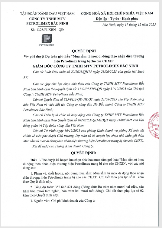 Công ty TNHH MTV Petrolimex Bắc Ninh Thông báo kế hoạch lựa chọn nhà thầu gói thầu “Mua sắm tủ inox di động theo nhận diện thương hiệu Petrolimex trang bị cho các CHXD”.