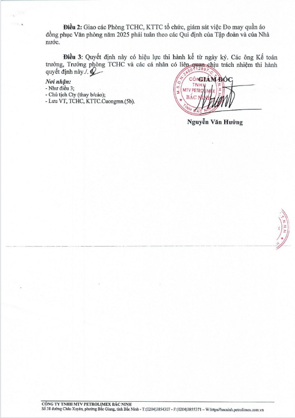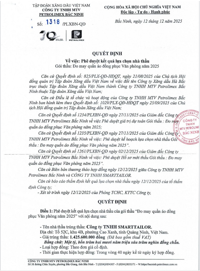 Công ty TNHH MTV Petrolimex Bắc Ninh Thông báo kết quả lựa chọn nhà thầu gói thầu “Đo may quần áo đồng phục Văn phòng năm 2025”.