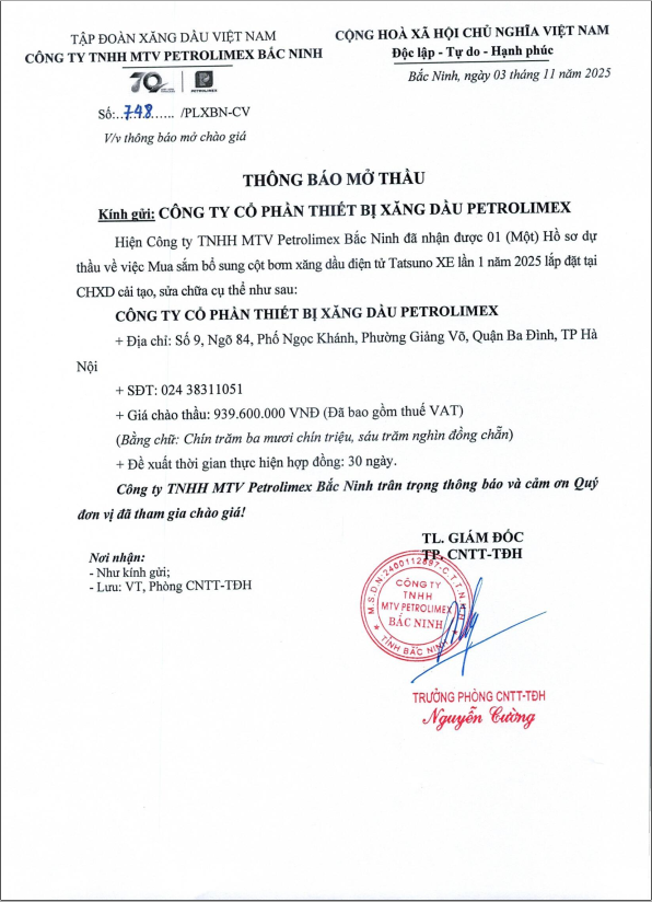 Công ty TNHH MTV Petrolimex Bắc Ninh Thông báo mở chào giá gói thầu "Mua sắm bổ sung cột bơm xăng dầu điện tử Tatsuno XE lần 1 năm 2025 lắp đặt tại CHXD cải tạo, sửa chữa"