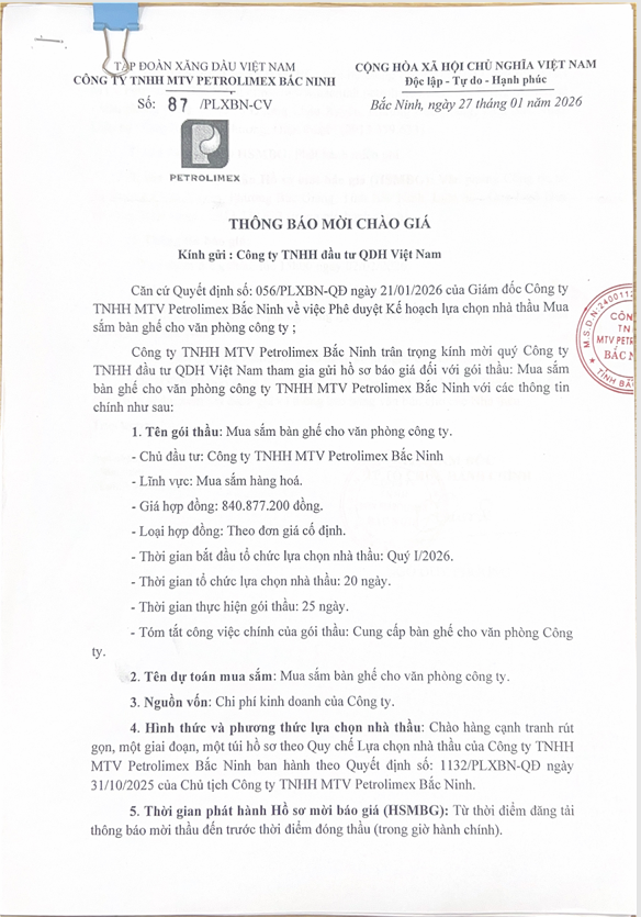 Công ty TNHH MTV Petrolimex Bắc Ninh Thông báo mời thầu Gói thầu: '' Mua sắm bàn ghế cho văn phòng Công ty''
