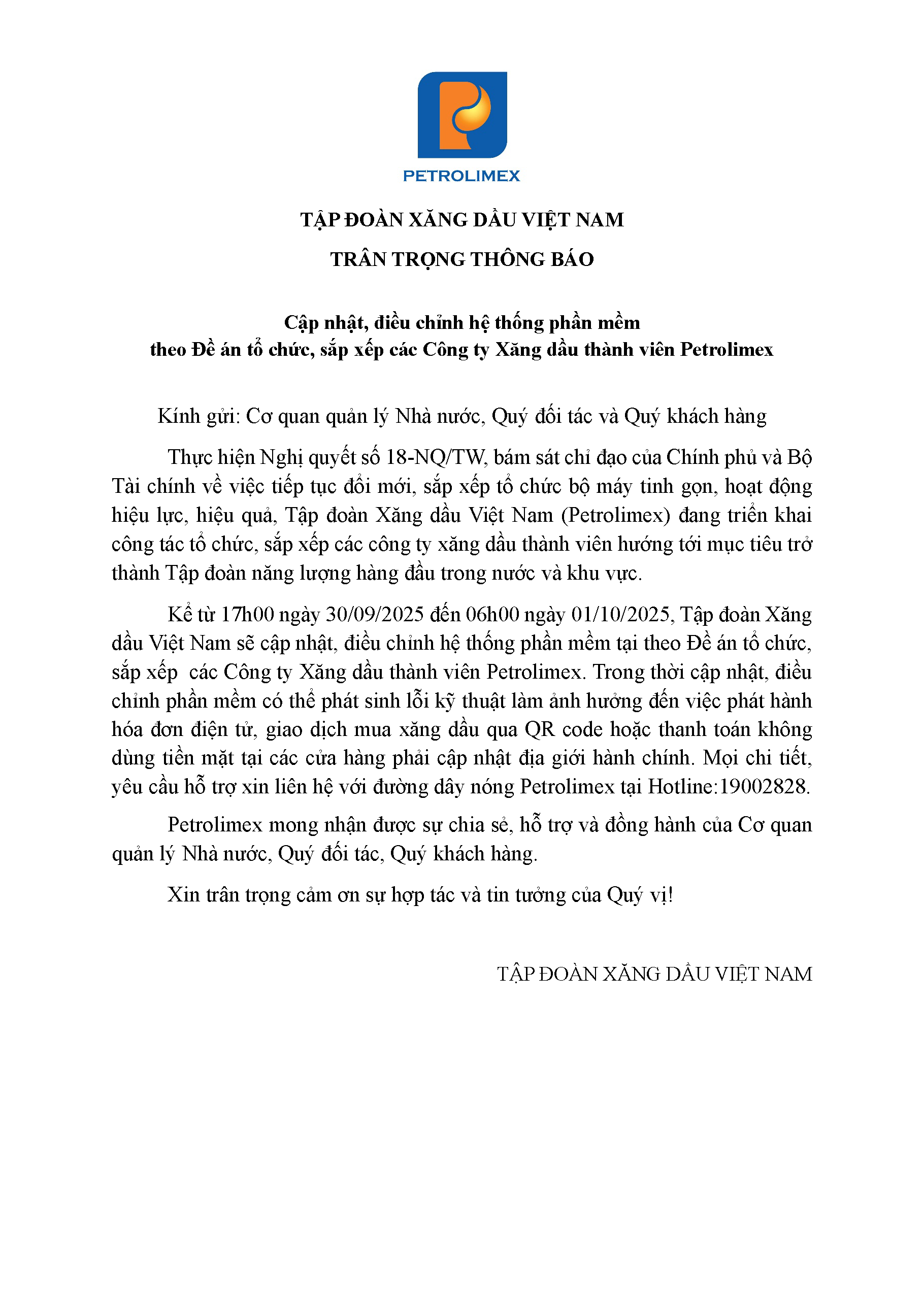 Thông báo cập nhật, điều chỉnh hệ thống phần mềm theo Đề án tổ chức, sắp xếp các CTXD thành viên Petrolimex